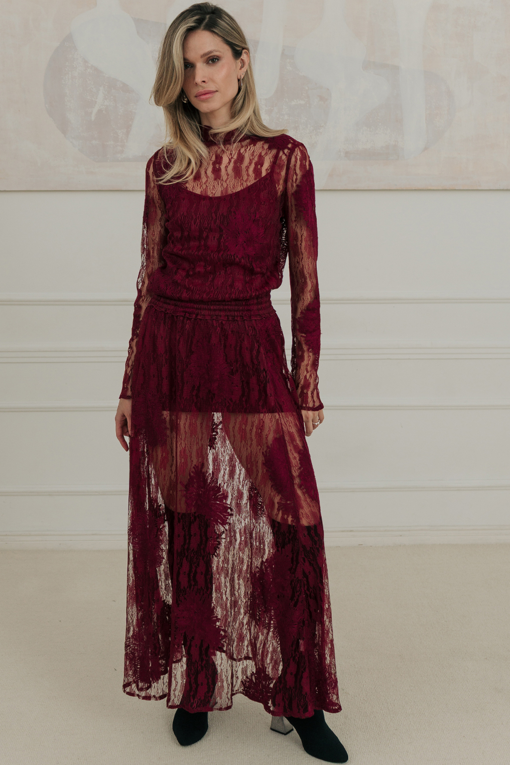 Modna propozycja długa, luźna, koronkowa spódnica. Spódnica maxi w kolorze burgundowym z koronki. Ozdobna guma w pasie i prześwity sprawiają, że spódnica jest niezwykle kobieca. Spódnica w komplecie z osobną halką na gumce o długości mini. Idealnie sprawdzi się na imprezę lub wyjście z przyjaciółmi. Świetnie komponuje się z krótkim golfem z tej samej tkaniny.